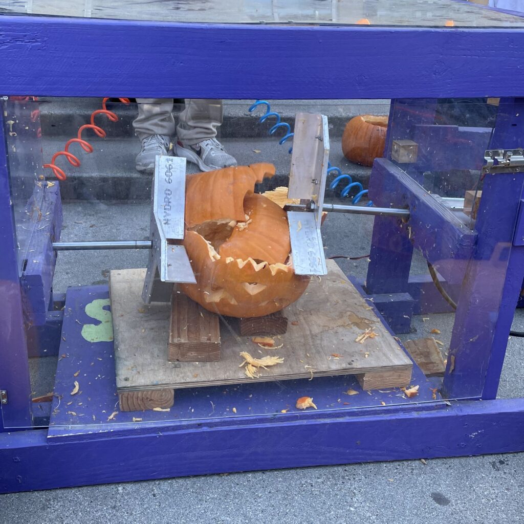 Here is a pumpkin being smashed. There were many different smashing machines for different sizes pumpkins. Our favorite was a hydraulic sledge hammer with 20 pounds of crushing force.